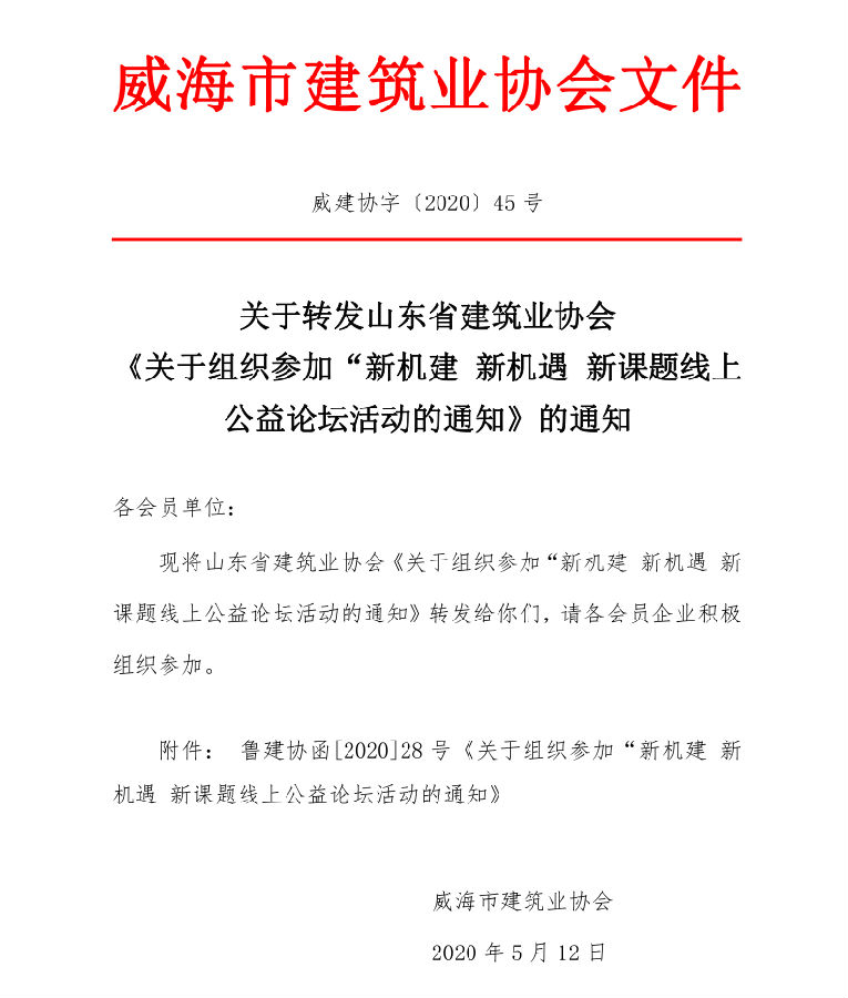 >關(guān)于轉(zhuǎn)發(fā)山東省建筑業(yè)協(xié)會(huì) 《關(guān)于組織參加“新機(jī)建 新機(jī)遇 新課題線上公益論壇活動(dòng)的通知》的通知