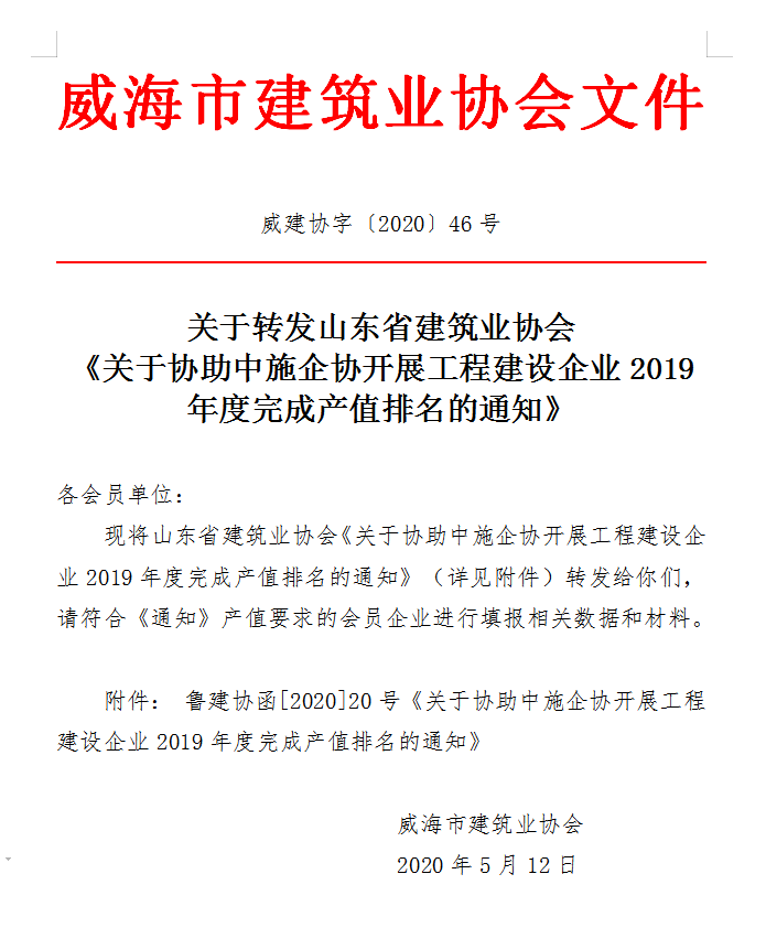 關(guān)于轉(zhuǎn)發(fā)山東省建筑業(yè)協(xié)會(huì) 《關(guān)于協(xié)助中施企協(xié)開展工程建設(shè)企業(yè)2019年度完成產(chǎn)值排名的通知》