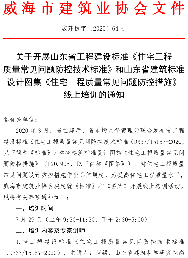 關(guān)于開展山東省工程建設(shè)標(biāo)準(zhǔn)《住宅工程 質(zhì)量常見問題防控技術(shù)標(biāo)準(zhǔn)》和山東省建筑標(biāo)準(zhǔn)設(shè)計圖集《住宅工程質(zhì)量常見問題防控措施》線上培訓(xùn)的通知