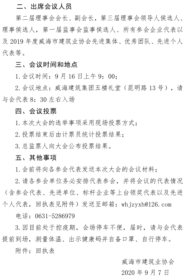 關(guān)于召開威海市建筑業(yè)協(xié)會(huì)第三屆會(huì)員代表大會(huì)暨2019年度威海市建筑業(yè)表彰大會(huì)的通知