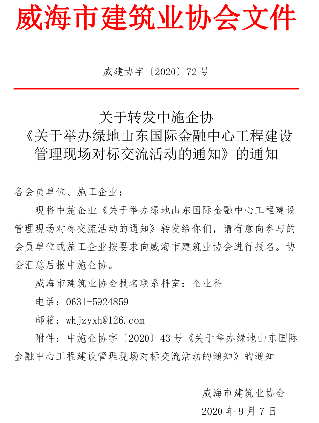 關(guān)于轉(zhuǎn)發(fā)中施企協(xié) 《關(guān)于舉辦綠地山東國際金融中心工程建設(shè)管理現(xiàn)場對標(biāo)交流活動的通知》的通知