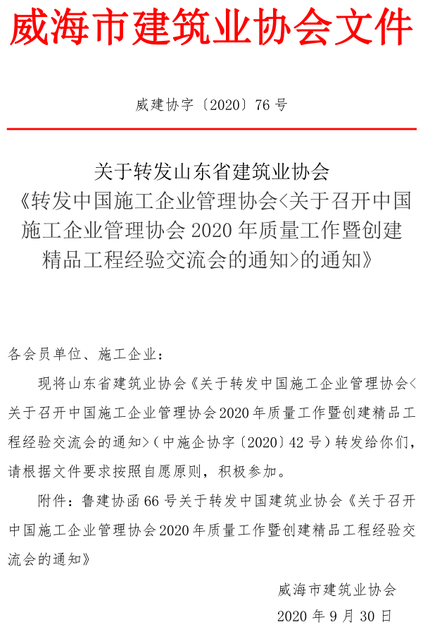 關于轉發(fā)山東省建筑業(yè)協(xié)會 《轉發(fā)中國施工企業(yè)管理協(xié)會<關于召開中國施工企業(yè)管理協(xié)會2020年質量工作暨創(chuàng)建精品工程經(jīng)驗交流會的通知>的通知》