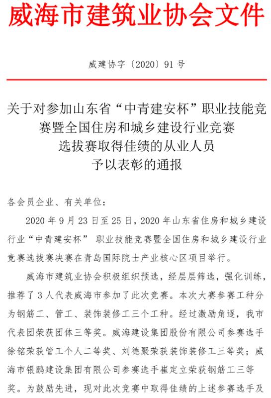 關(guān)于對(duì)參加山東省“中青建安杯”職業(yè)技能競(jìng)賽暨全國(guó)住房和城鄉(xiāng)建設(shè)行業(yè)競(jìng)賽 選拔賽取得佳績(jī)的從業(yè)人員予以表彰的通報(bào)