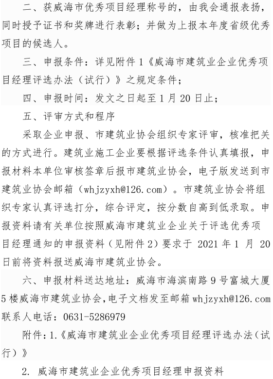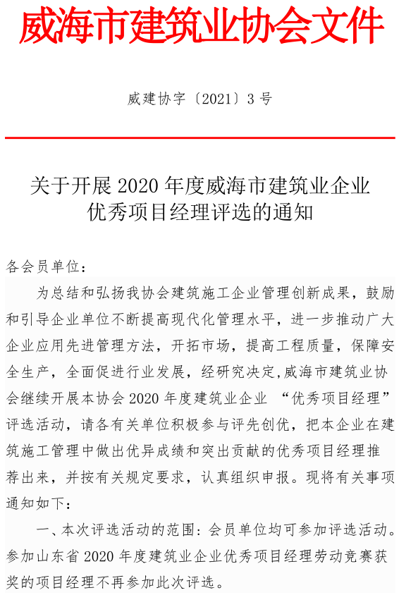 關(guān)于開展2020年度威海市建筑業(yè)企業(yè)優(yōu)秀項(xiàng)目經(jīng)理評(píng)選的通知