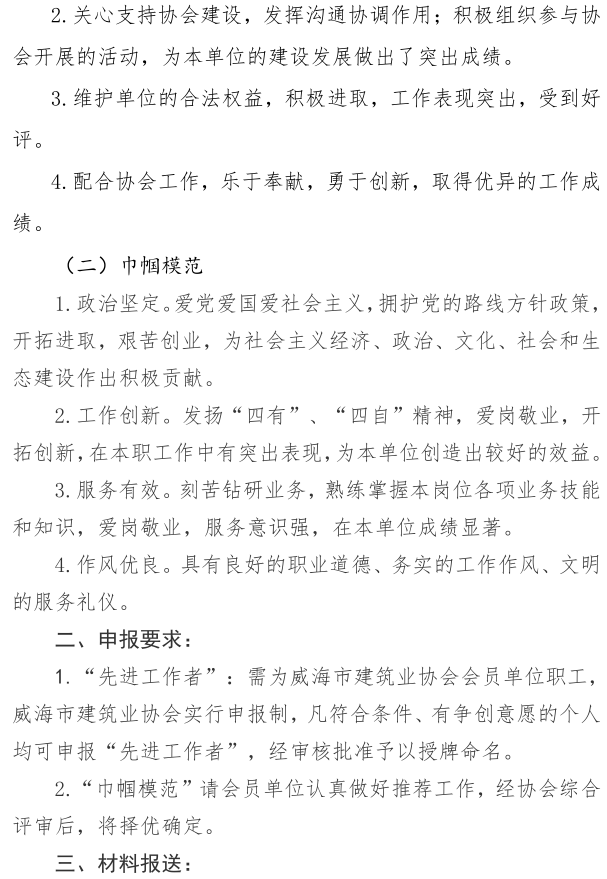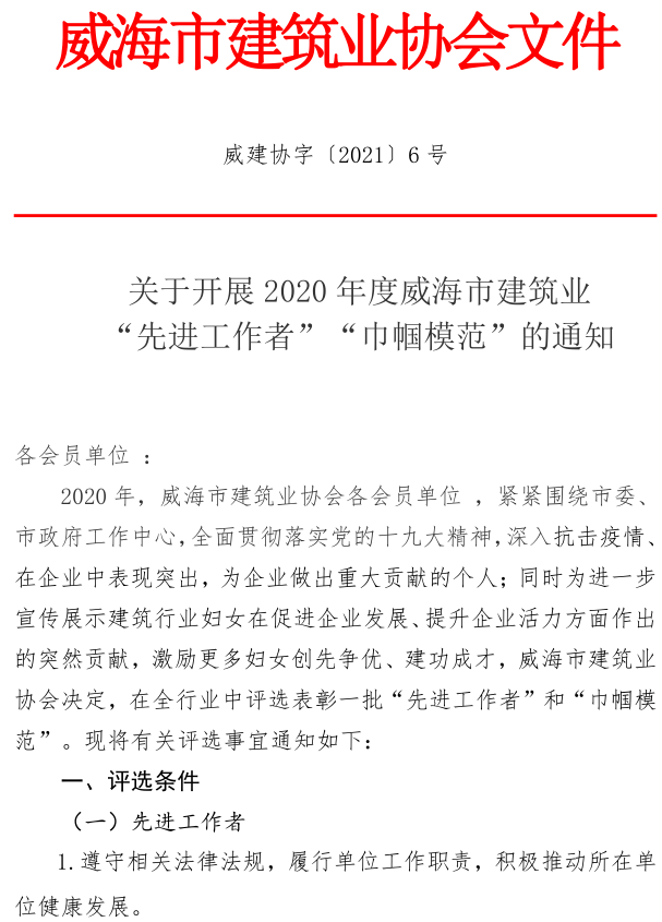 關(guān)于開展2020年度威海市建筑業(yè) “先進(jìn)工作者”“巾幗模范”的通知
