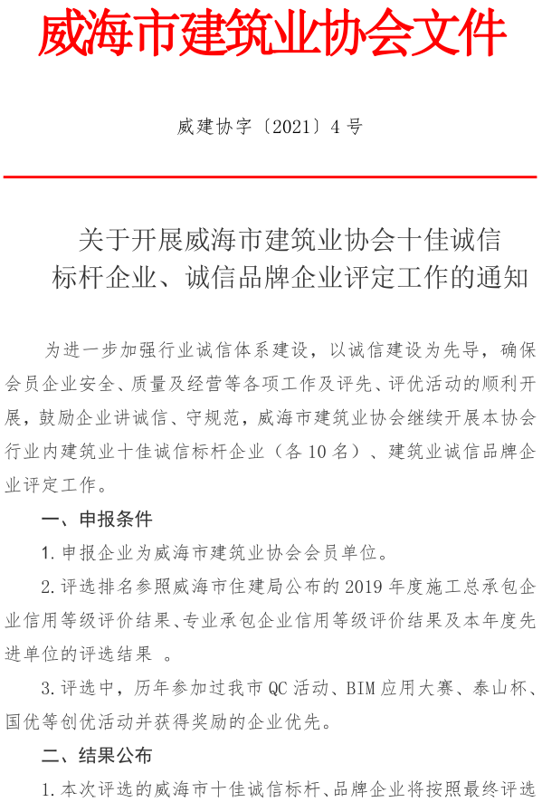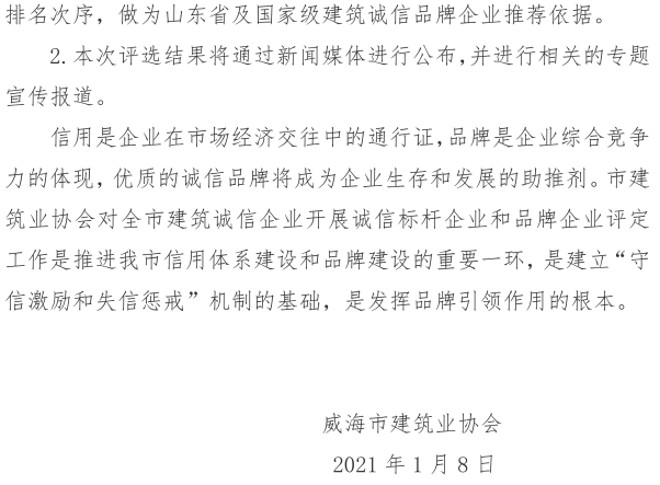 >關于開展威海市建筑業(yè)協(xié)會十佳誠信 標桿企業(yè)、誠信品牌企業(yè)評定工作的通知