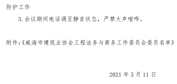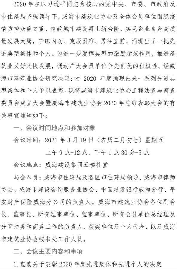 >關(guān)于召開威海市建筑業(yè)協(xié)會工程法務(wù)與商務(wù) 工作委員會成立大會暨威海市建筑業(yè)協(xié)會 2020年總結(jié)表彰大會的通知