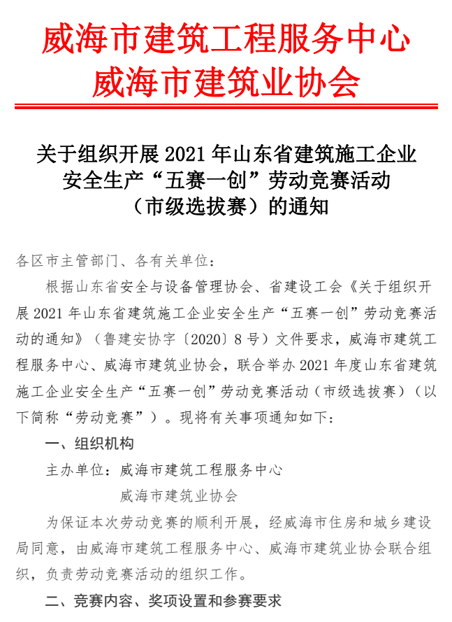 關于組織開展2021年山東省建筑施工企業(yè) 安全生產(chǎn)“五賽一創(chuàng)”勞動競賽活動 (市級選拔賽)的通知