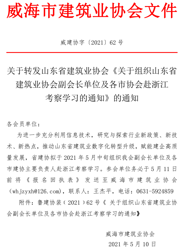 關(guān)于轉(zhuǎn)發(fā)山東省建筑業(yè)協(xié)會(huì)《關(guān)于組織山東省建筑業(yè)協(xié)會(huì)副會(huì)長(zhǎng)單位及各市協(xié)會(huì)赴浙江考察學(xué)習(xí)的通知》的通知