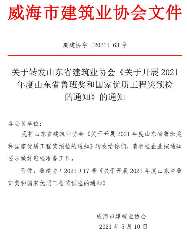 關(guān)于轉(zhuǎn)發(fā)山東省建筑業(yè)協(xié)會(huì)《關(guān)于開(kāi)展2021年度山東省魯班獎(jiǎng)和國(guó)家優(yōu)質(zhì)工程獎(jiǎng)?lì)A(yù)檢的通知》的通知