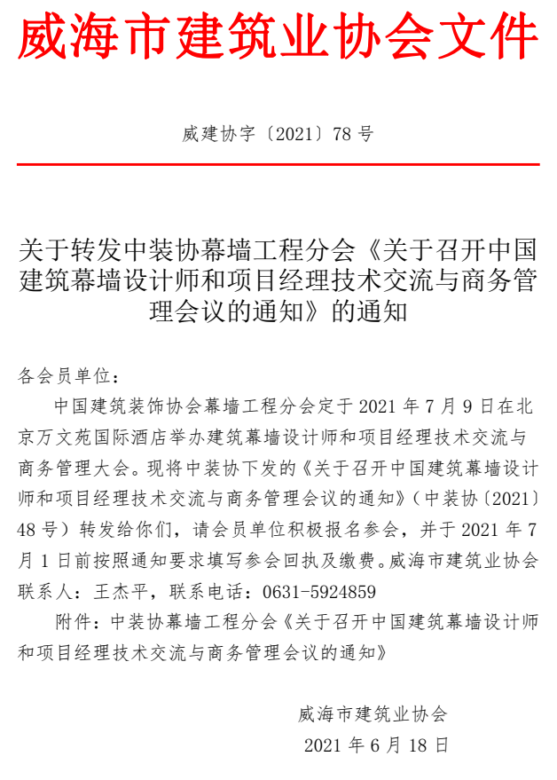 - 當(dāng)前位置:首頁 >文件公告>關(guān)于轉(zhuǎn)發(fā)中裝協(xié)幕墻工程分會《關(guān)于召開中國建筑幕墻設(shè)計(jì)師和項(xiàng)目經(jīng)理技術(shù)交流與商務(wù)管理會議的通知》的通知