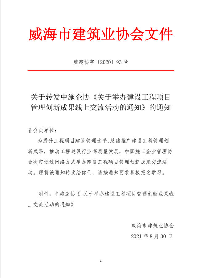 >關于轉(zhuǎn)發(fā)中施企協(xié)《關于舉辦建設工程項目管理創(chuàng)新成果線上交流活動的通知》的通知