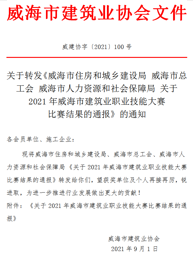 關(guān)于轉(zhuǎn)發(fā)《威海市住房和城鄉(xiāng)建設(shè)局 威海市總工會 威海市人力資源和社會保障局 關(guān)于2021年威海市建筑業(yè)職業(yè)技能大賽 比賽結(jié)果的通報》的通知