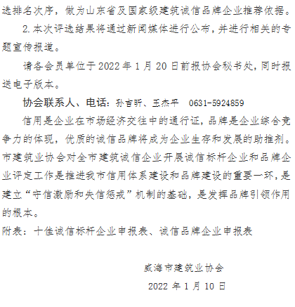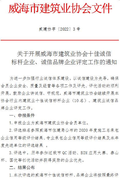 >關(guān)于開(kāi)展威海市建筑業(yè)誠(chéng)信標(biāo)桿企業(yè)、誠(chéng)信品牌企業(yè)評(píng)定工作的通知