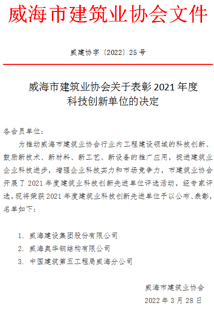 >威海市建筑業(yè)協(xié)會(huì)關(guān)于表彰2021年科技創(chuàng)新單位的決定
