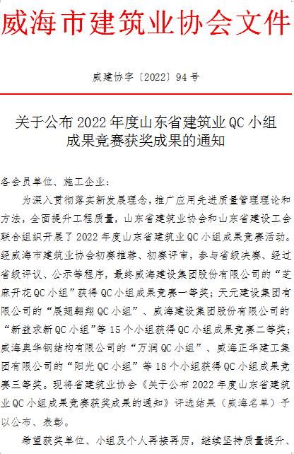 >關(guān)于公布2022年度山東省建筑業(yè)QC小組成果競賽獲獎成果的通知