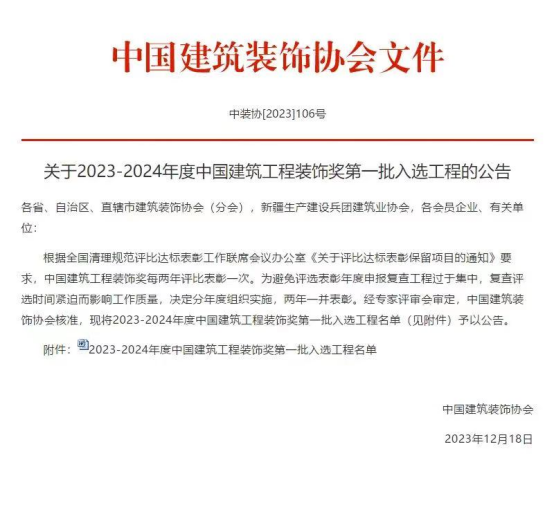 近日,中國建筑裝飾協(xié)會發(fā)布《關(guān)于2023-2024年度中國建筑工程裝飾獎第一批入選工程的公告》(中裝協(xié)〔2023〕106號),我市推薦申報的4項工程被授予“中國建筑工程裝飾獎”,其中公共建筑裝飾類4項,建筑幕墻類1項。