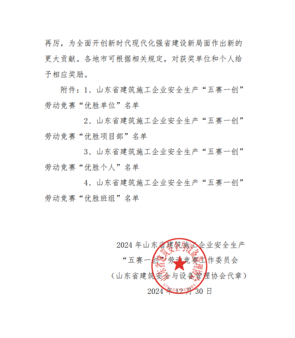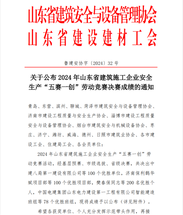 近日,山東省建筑安全與設(shè)備管理協(xié)會發(fā)布《關(guān)于公布2024年山東省建筑施工企業(yè)安全生產(chǎn)“五賽一創(chuàng)”勞動競賽決賽成績的通知》,威海市榮獲“優(yōu)勝單位”3個,“優(yōu)勝項目部”5個,“優(yōu)勝班組”5個,“優(yōu)勝個人”12名。