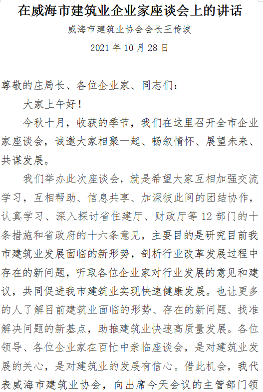建筑業(yè)協(xié)會(huì)企業(yè)家座談會(huì)王傳波會(huì)長(zhǎng)講話