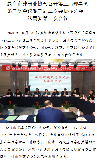 威海市建筑業(yè)協(xié)會(huì)召開(kāi)第三屆理事會(huì)第三次會(huì)議暨三屆二次會(huì)長(zhǎng)辦公會(huì)、法商委第二次會(huì)議